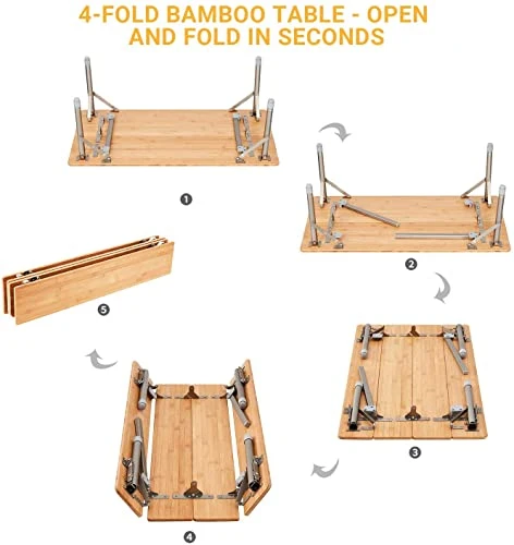 - Environmental Anti-UV Bamboo Table – The lightweight camping table top is made from natural bamboo, which is UV treatment, water resistant, environmentally friendly and easy to wipe clean, legs were made from aluminum alloy, which is lightweight but sturdy.