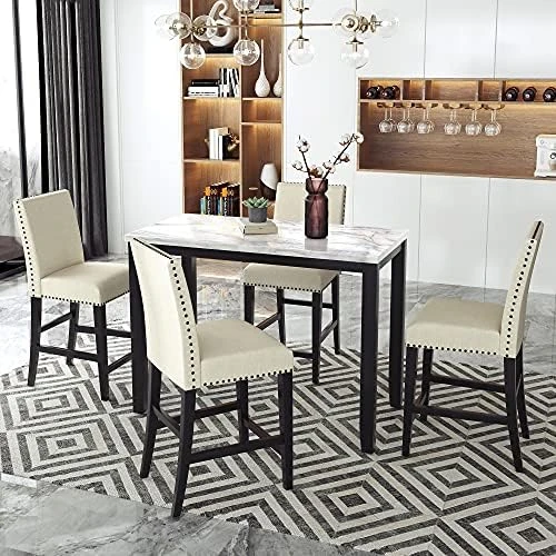 - ☛ ELEGANT STYLE – The combination of MDF frame and marble tabletop adds a modern touch, the tabletop’s elegant natural marble texture and low-saturated color chairs are perfect for any dining space, kitchen area, etc. Moreover, the black stand neutralizes the soft elements of the tabletop and chair body, accentuating the sense of power.