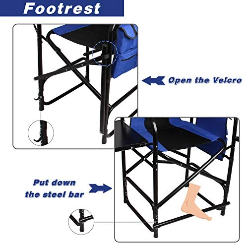 - FOOTREST: Because the chair is too tall, your feet cant touch the ground, so there is a steel bar for placing your feet when you sit on the tall chair. The steel bar can be put up and fixed by a velcro.
